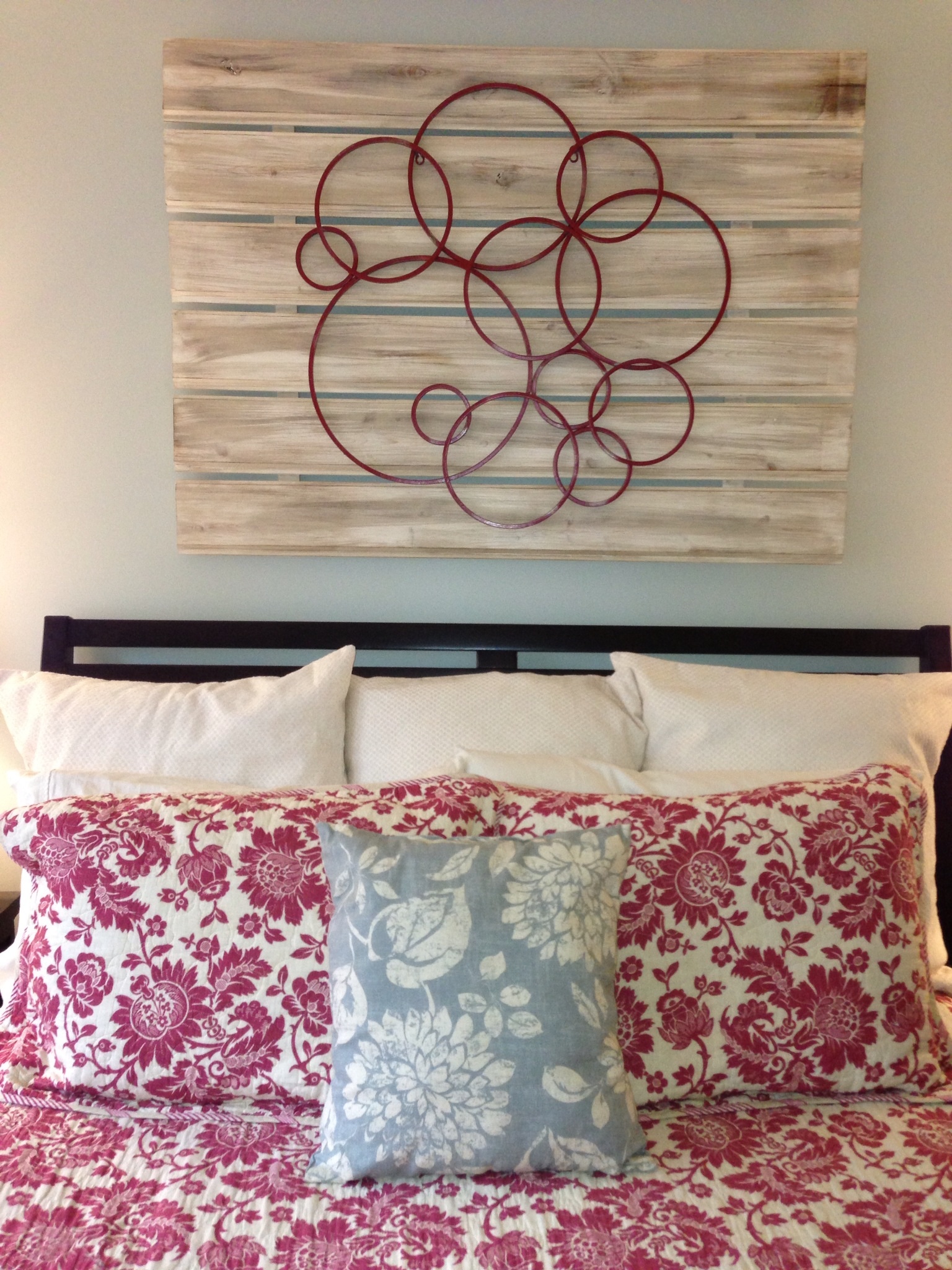 I came upon a silver metal circle art wall hanging at Pier One and immediately imagined it painted barn red mounted on a pallet.  I confess…we broke down and made our own pallet which I feel guilty about because I am a loyal re-purposer.