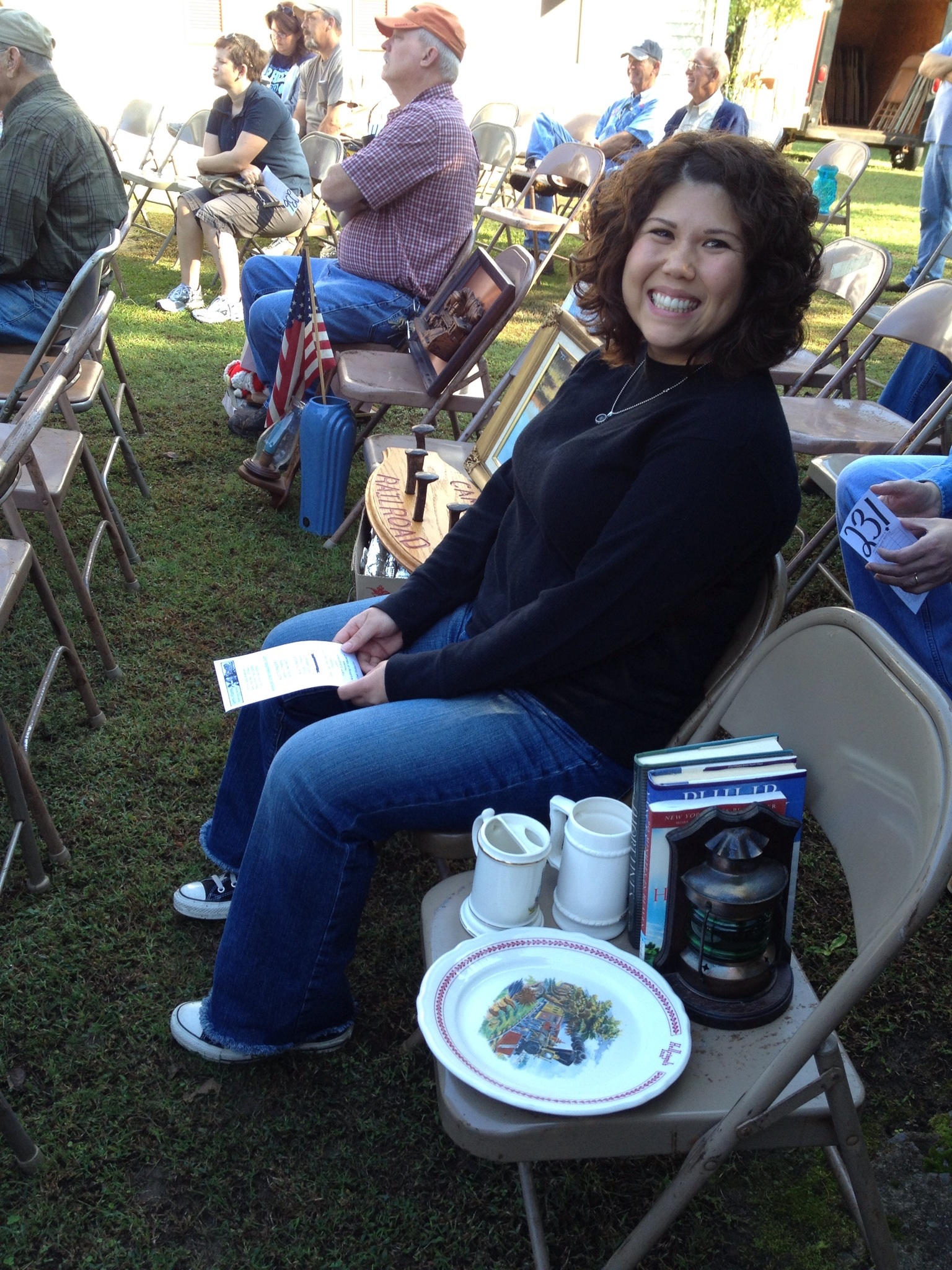 estate sale which is like a garage sale but you get to shop the whole house but when we walked around to the back there it was…….speakers blaring the lightening speed auctioneer calls, people were flashing up their numbers, it was love at first sight! I had no intention of participating. Auctions are intimidating but I told my husband I wanted to stay and watch. He bought a bid number just in case we did want to buy something and the rest is history. I was there almost 10 hours! They had to about kick me off the property. That’s me at my very first auction!